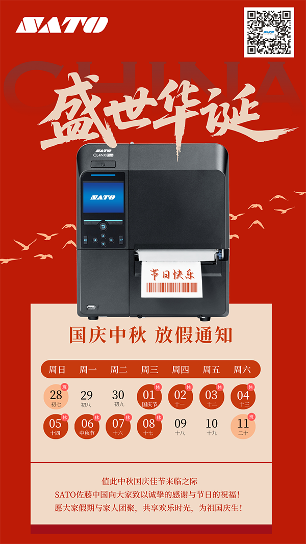 SATO佐藤中国2025年国庆、中秋节放假通知:2025年10月1日~2025年10月8日,佐藤中国区(含佐藤上海总部、佐藤深圳分公司、广州、大连、无锡、天津、青岛、武汉、苏州、江门、沈阳、重庆、杭州各地分支机构)休假,10月9日恢复正常营业。