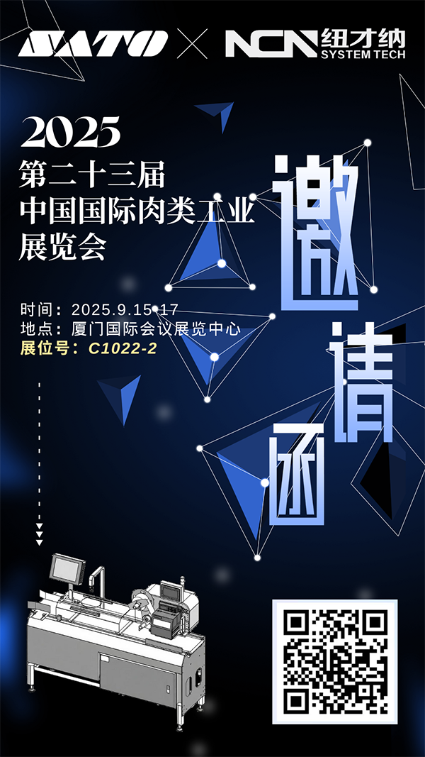 2025年9月15日-17日,厦门国际会议展览中心,第二十三届中国国际肉类工业展览会,SATO佐藤中国携手NCN纽才纳诚意联合出展!聚焦“AI赋能称重贴标,构建食品安全新标准”,带来革新性「AI识别 + 自动称重贴标」解决方案,现场亮相C1022-2展位,邀您共探食品数字化追溯新未来!
