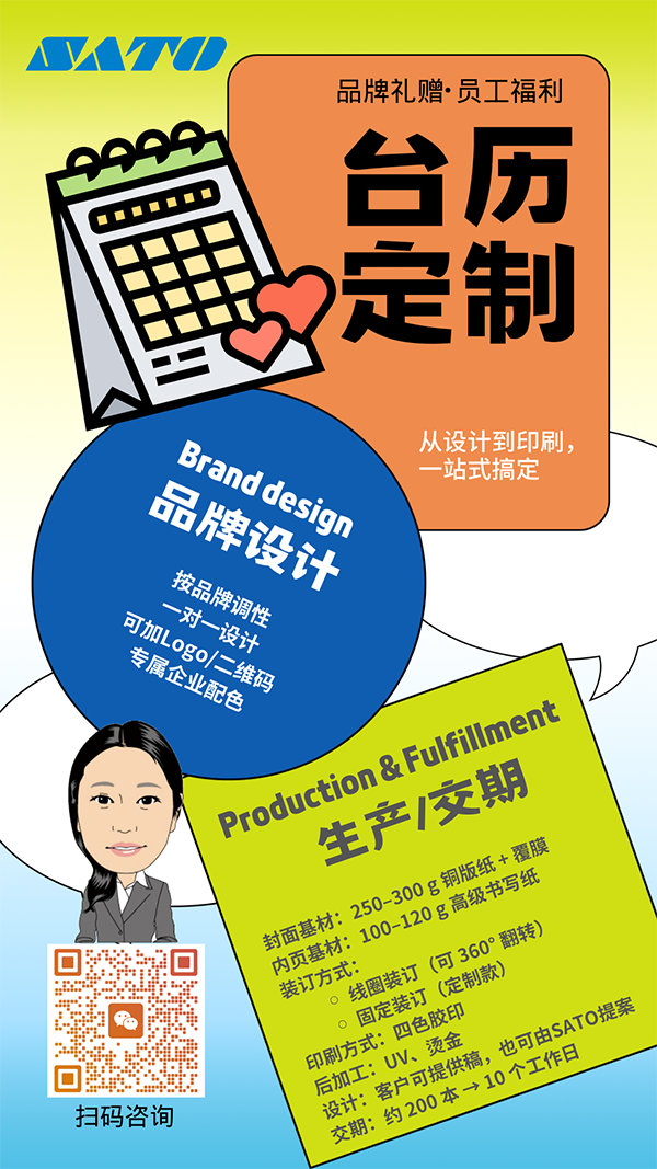 ??想为品牌定制专属台历?SATO支持小批量定制、个性化设计、企业配色、Logo定制等多种需求。采用铜版纸封面+高级书写纸内页,四色胶印+UV/烫金工艺,品质在线,交期稳定,适合企业礼赠、客户答谢、员工福利等多种场景,助力企业形象升级!