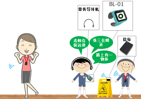 该系统包含带有信标的学校员工、学生和客人的姓名标签。信标也被绑定到校园里的障碍物上。学生只需轻敲BL-012可穿戴设备3次即可通过骨导耳机接受到语音提示,知晓谁或什么在他们附近。