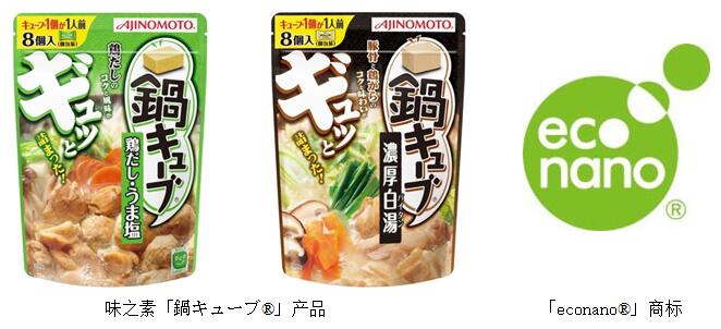 econano是基于纳米技术,燃烧时将碳元素固化成灰残留下来,减少CO2排放的技术。2012年,味之素株式会社第一次采用econano环保技术,之后随着销售的顺利进行,增加了品种,现在「鍋キューブ®」8块装的7个品种全都采用了econano技术。在这个基础上,与采用econano之前相比,燃烧时可减少25%的CO2排放,预计一年大约减少CO2排放量44吨。