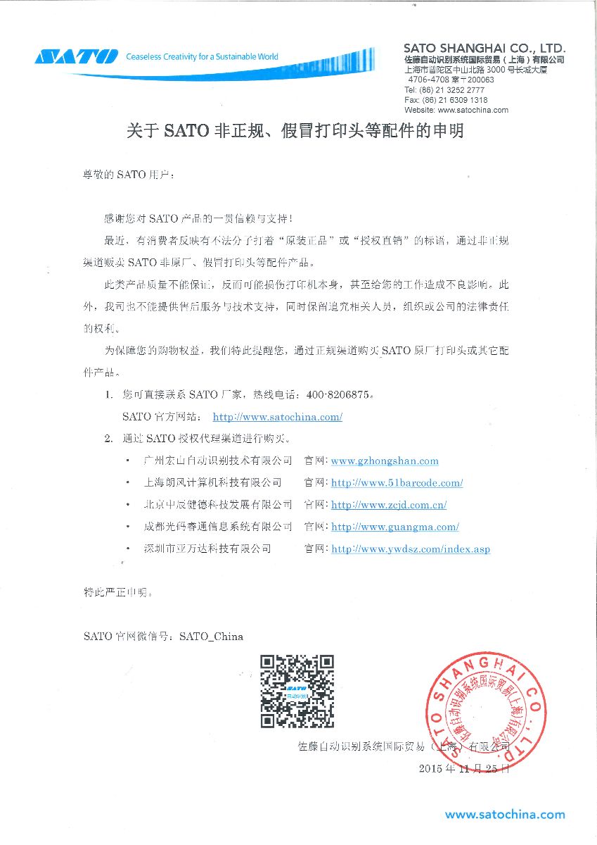 关于SATO非正规、假冒打印头等配件的申明