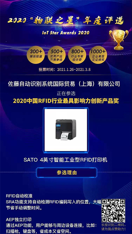 一年一度的“物联之星”评选活动现已正式开始!SATO今年以爆款产品4英寸智能工业型RFID打印机——CL4NX Plus作为“参赛选手”,诚邀各位点赞助力,为SATO投出您宝贵的一票!