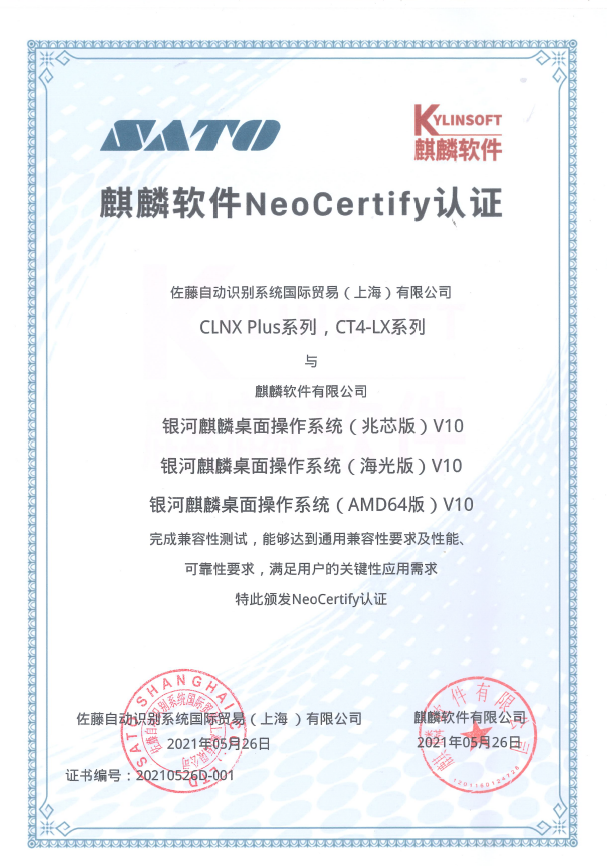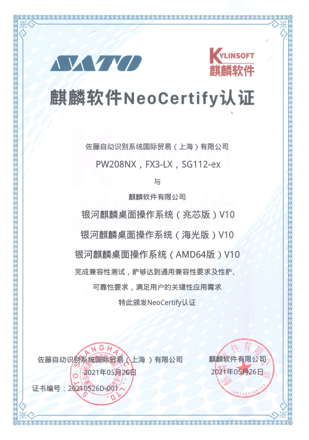 SATO下记机型打印机与麒麟软件有限公司的下记操作系统完成兼容性测试,能够达到通用兼容性要求及性能、可靠性要求,满足用户的关键性应用需求,通过了Neo Certify认证。