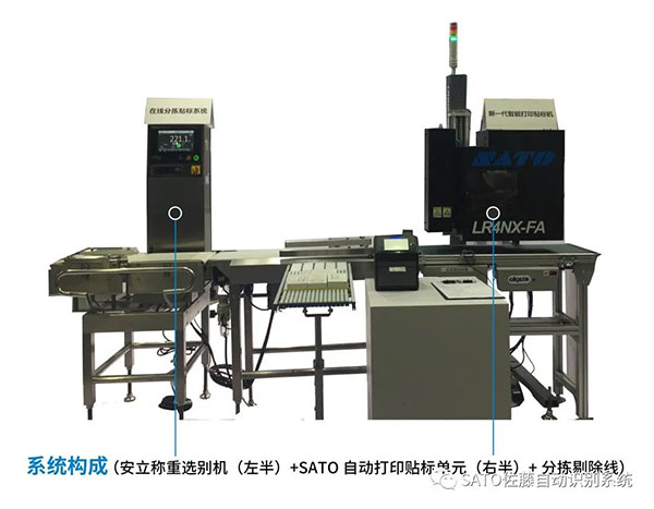 SATO在线称重分拣贴标系统,由在线称重、分拣剔除、即时打印贴标三个单元组成。
