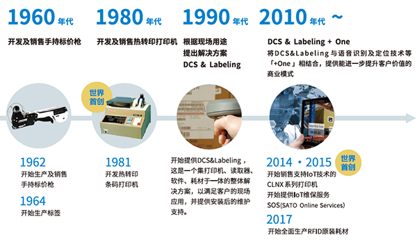 手持标价枪的发明是佐藤识别业务的起源,而后随着时代进步,1980年代超市和专卖店开始采用POS系统,并快速成长。1981年,SATO为真正的POS时代到来做准备,制造研发出世界首款热转印打印机。