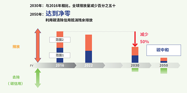 - 到 2030 财年,将全球范围 1 和 2 排放量减少 50%(相比2016 财年)。